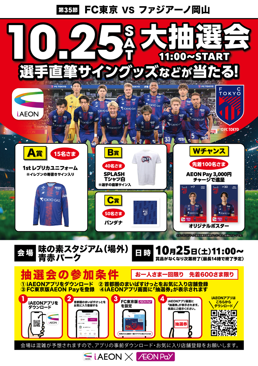 On Saturday, October 25, 2025, at the Meiji Yasuda J1 League Sec. 35 match vs Fagiano Okayama (2:00 p.m. kickoff / Ajinomoto Stadium), our official partner AEON CO., LTD. will set up a booth.