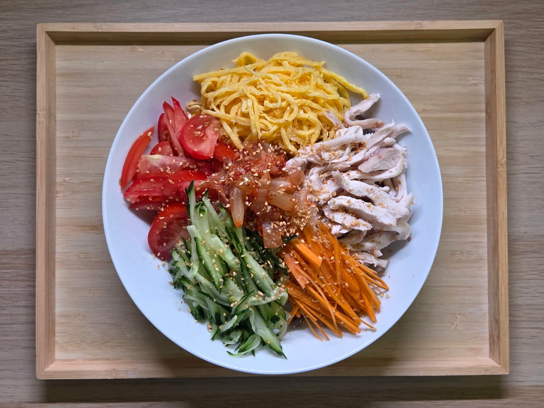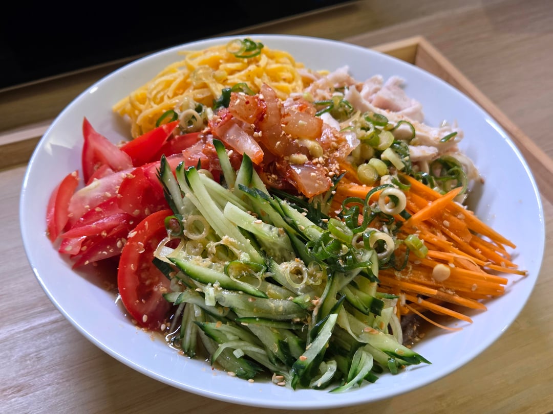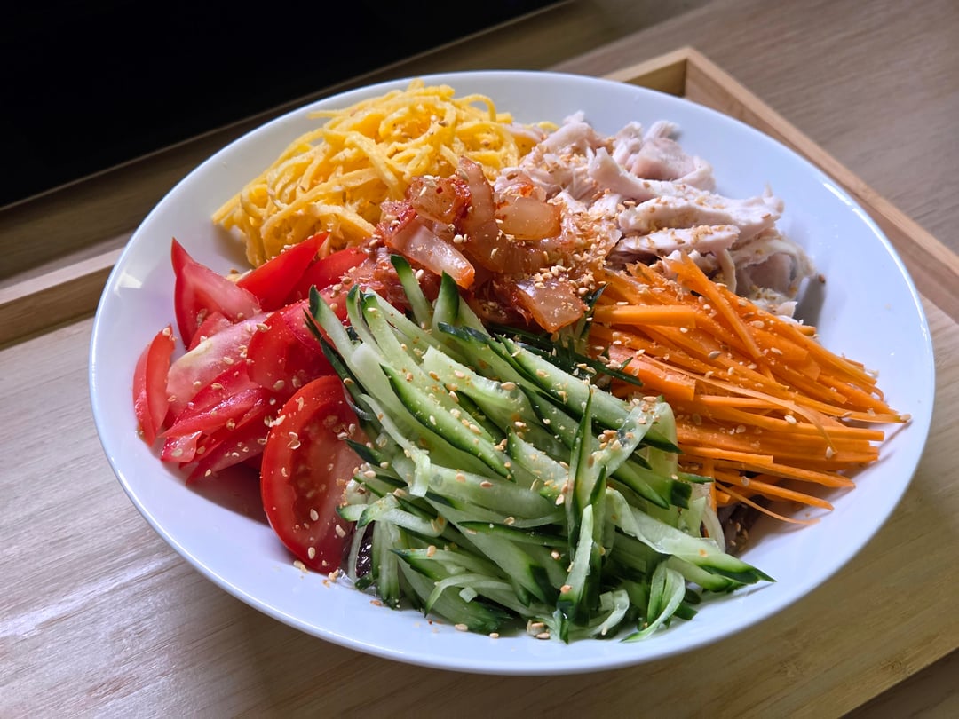 Cucumber, carrot, tomato, egg, poached chicken, kimchi, and a tsuyu, ginger, scallion sauce I poured on top and mixed together.by HolyHypodermics foodjapanese food 1 Comment snorbalp 15 hours ago That’s pretty much hikaichuka