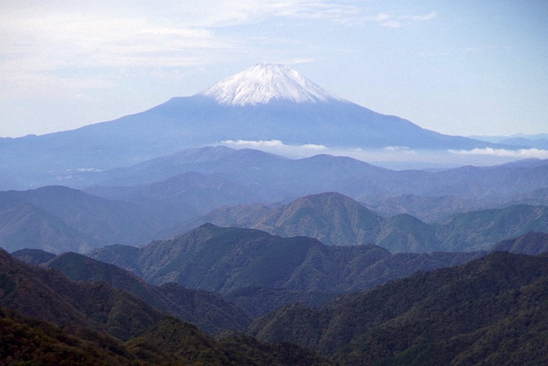 A snowcapped Mount Fuji is seen from the summit of Mount To in Kanagawa Prefecture, Oct. 23, 2025. (Mainichi/Naoki Watanabe)