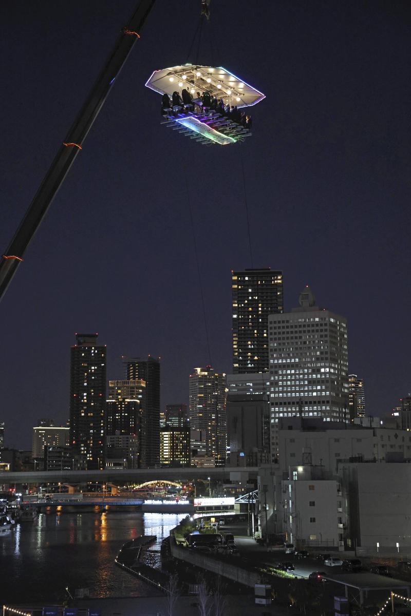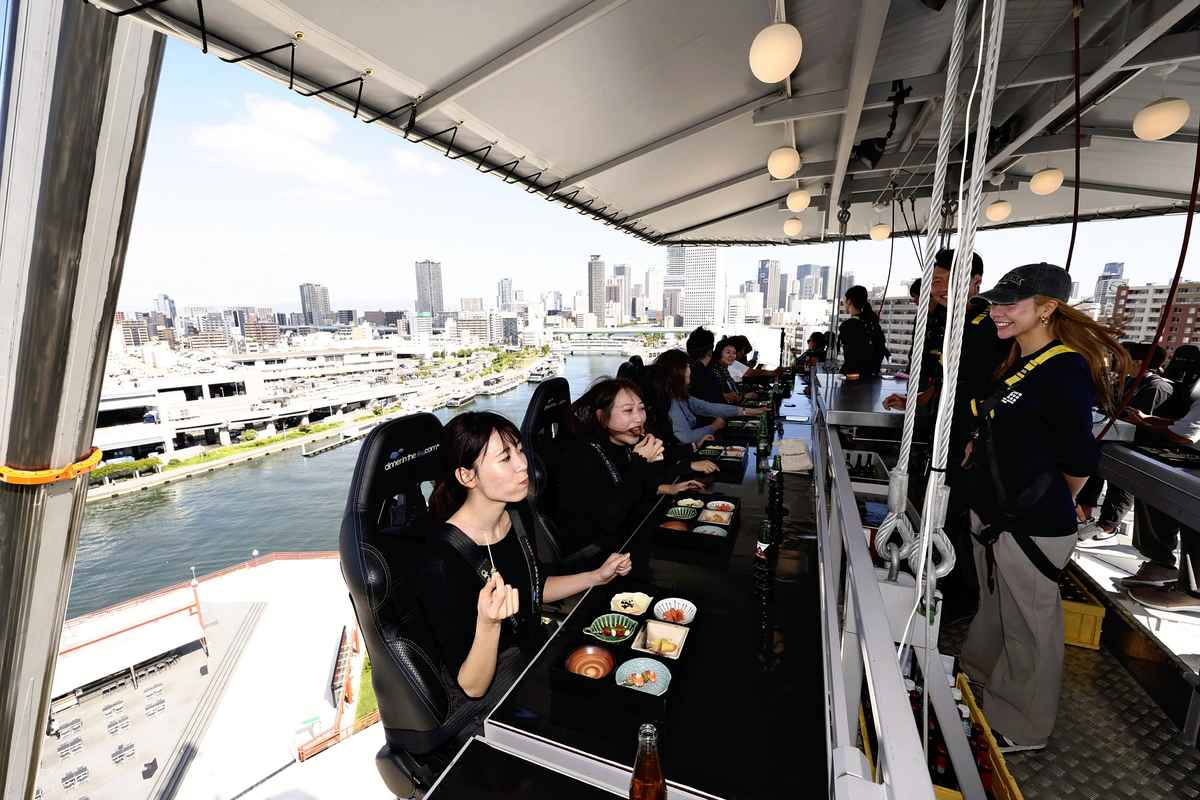 OSAKA — A “sky restaurant” where diners can enjoy meals while experiencing the thrill of floating on a platform hoisted 40 meters above the ground by a crane recently opened for a limited time at the Nakanoshima Gate South Pier commercial facility in Nishi Ward, Osaka.