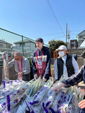 Camden Gregory, middle, helping run a stand for selling Matsudo’s “Yakiri Negi” leeks at the 2025 Kawazu-zakura Festival. (Photo courtesy of the author)