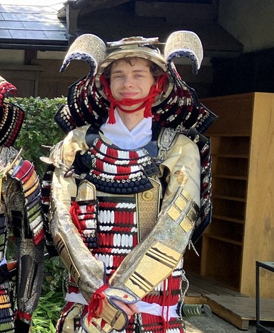 Camden Gregory trying on samurai armor at the Tojo-tei Residence. (Photo courtesy of the author)