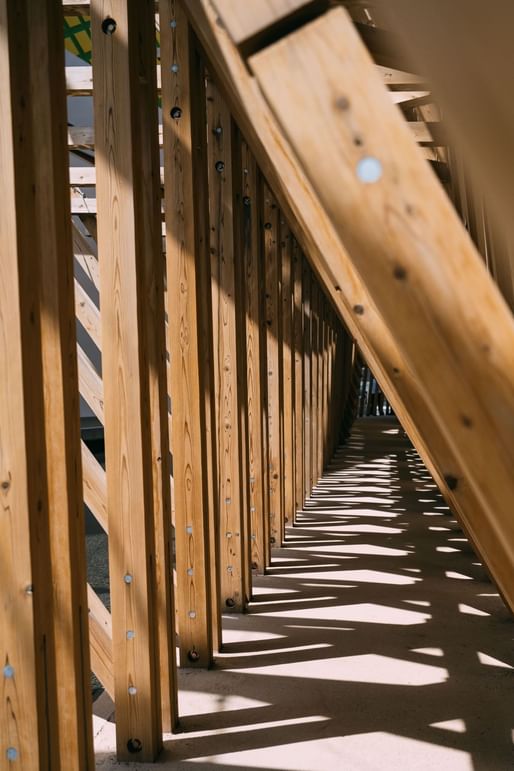 In response to the requirement that all structures at the expo be dismantled once the exhibition ends, the pavilion was designed with future disassembly and potential reuse in mind. The construction system relies on natural, locally sourced materials, such as Japanese red cedar wood, simple dry-assembled joints, and the use of a single element to address multiple needs.
