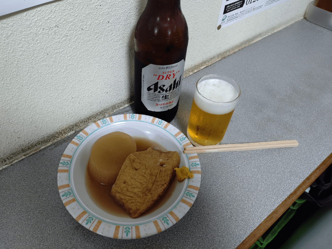 Asahi Super Dry beer and Oden(Japanese-radish and deep-fried-tofu) by Snoo-60039 foodjapanese food 1 Comment corntorteeya 4 days ago I like chikuwabu, tamago, and kinchaku. Daikon is good, too.