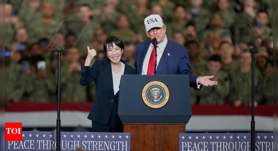 Japan’s new Prime Minister Sanae Takaichi could not contain her excitement as she jumped in joy on stage while sharing the spotlight with US President Donald Trump aboard the USS George Washington on Tuesday.The moment came as Trump introduced her to a cheering crowd of American troops in Tokyo, hailing her as “the first female prime minister in the history of Japan.” Takaichi pumped her fist and beamed with delight.Trump made a dramatic entrance aboard the aircraft carrier, descending on a giant lift flanked by fighter jets and missiles. He praised Japan’s new leader, saying during a later business reception, “I’m so happy to have gotten to know your new Prime Minister. I think she’s going to go down as great.” He added, “She’s got all of our support.”Earlier in the day, Takaichi returned the compliment, saying she would nominate Trump for next year’s Nobel Peace Prize.Trump addressed the troops, flaunting US military capabilities. “You see that nobody makes equipment like we do. Nobody makes the ammunition, the weapons, the missiles, planes, none of it,” he told the crowd. “And if they do, the American sailor stands ready to crush them and sink them and wreck them and blast them into oblivion, right?”Realising his fiery tone, Trump added jokingly, “That’s a terrible statement to make. That takes me out of the running [for the Nobel Peace Award].”The president went on to call the troops “incredible people, good-looking people, too many good-looking people.” He added, “I don’t like good-looking people. I never liked good-looking people, I’ll be honest with you. Never admitted that before.”Takaichi, a protégé of the late Shinzo Abe, has been closely aligned with Trump’s style of politics. Their rapport was clear throughout the day, with Trump even calling her “a winner.”