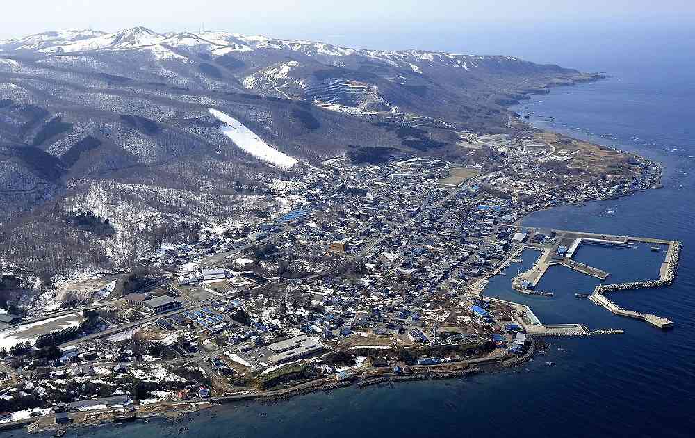 Aerial view of Suttsu, Hokkaido, photographed from a chartered helicopter on March 25, 2025