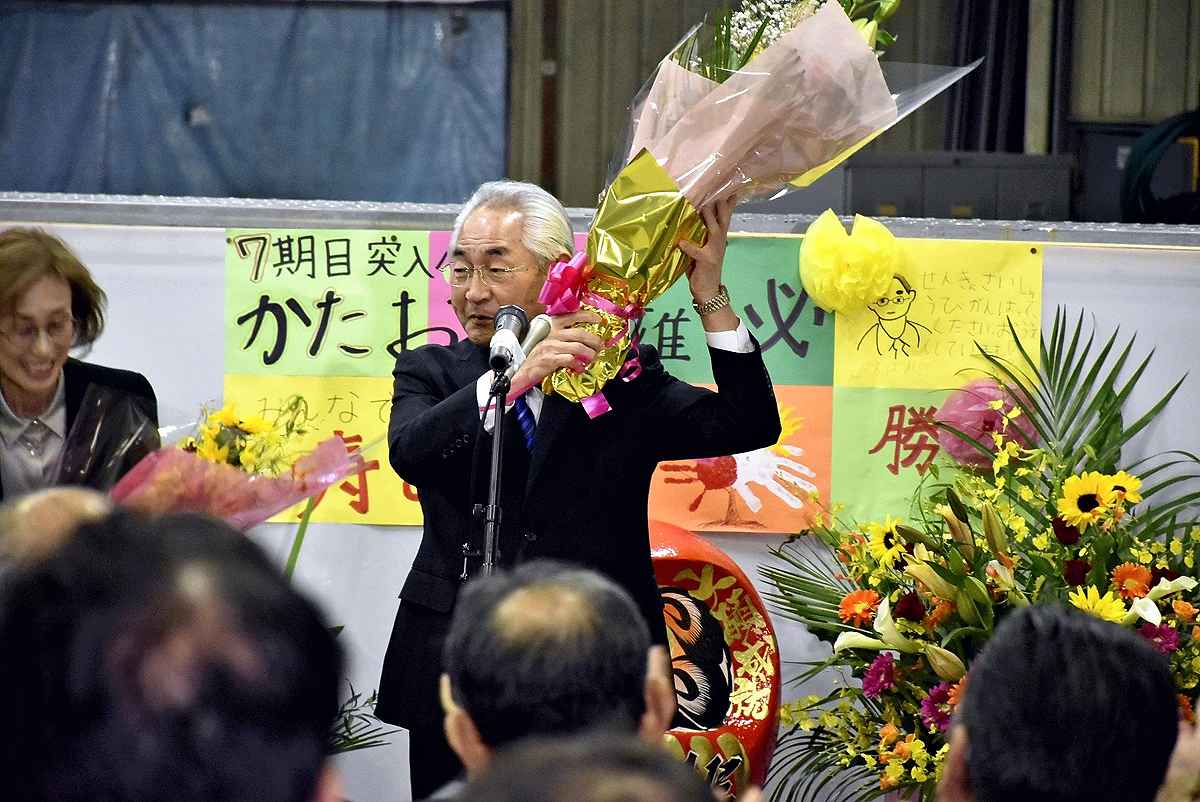 Haruo Kataoka celebrates his election win with supporters in Suttsu, Hokkaido, at 8:57 p.m. on Tuesday