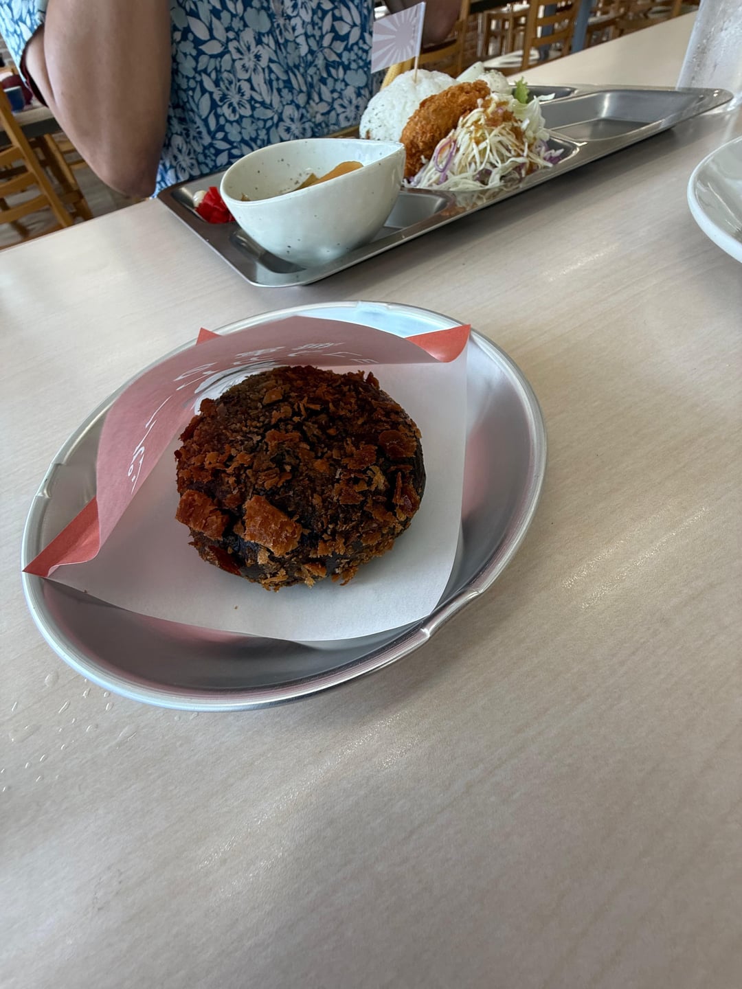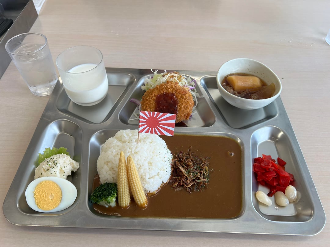 Photos 10-13: Kure JMSDF support facility canteen: JMSDF navy curry served by naval reserve personnel. That croquette on the plate on photo 11 was supposed to be whale meat but I got it substituted for beef. The chocolate curry bun on 12/13? Both it and the navy curry sounds and looks better than it was…really a bit “mid”.