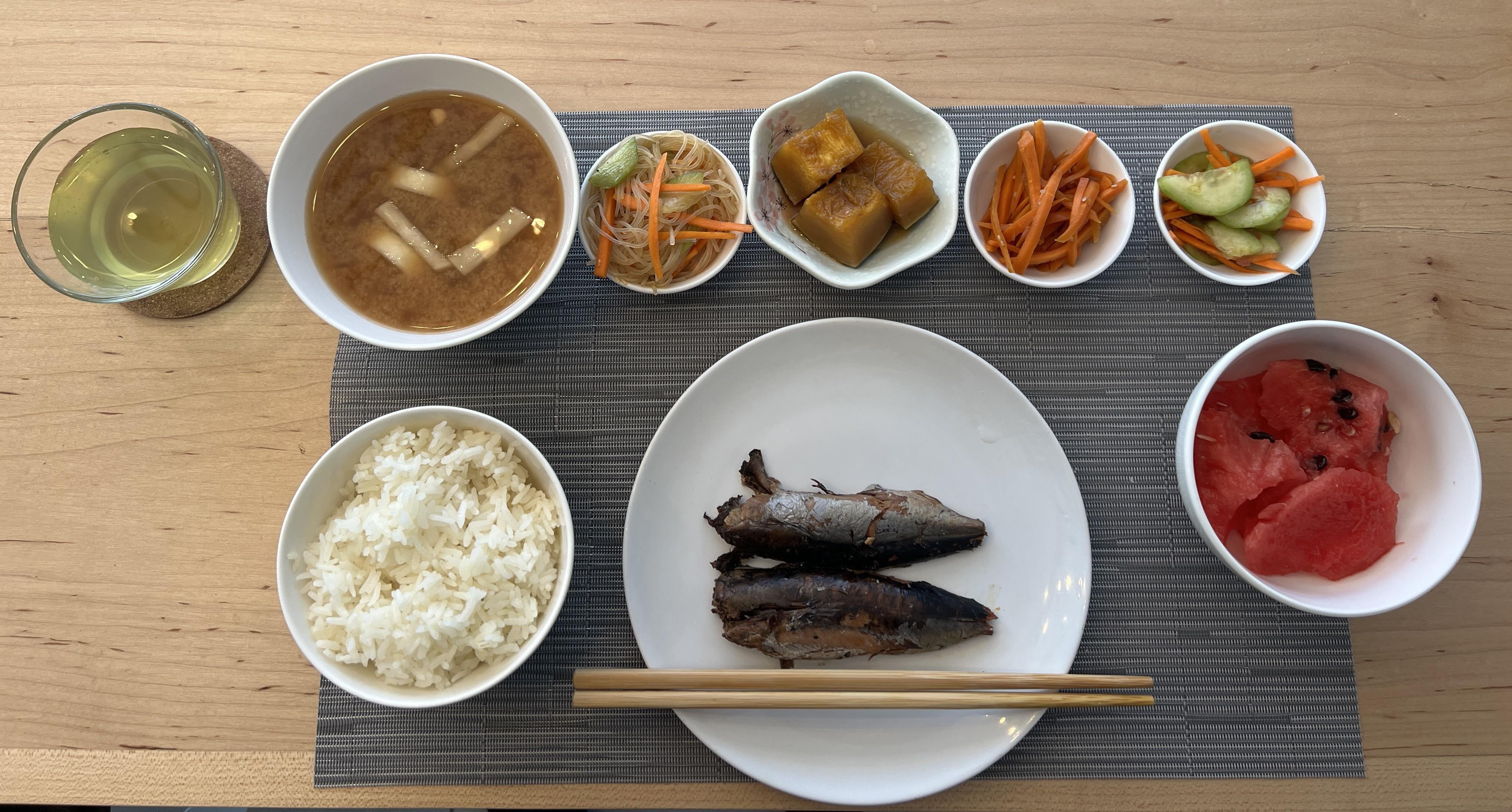 Miso soup with dongchimi daikon Harusame cold salad Simmered kabocha Carrot kinpira Umeboshi cucumber carrot salad Watermelon Broiled sardine Steamed rice Cold steeped green tea by Bananafone28 foodjapanese food 1 Comment WrongOnEveryCount 6 hours ago Looks great. Homemade or at a hotel? Also an extra line break is needed for your list to be a list, rather than a word salad.