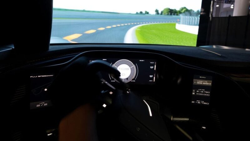 All-in, this looks like it’s a highly custom build of Gran Turismo 7 — one of the screens also shows the phrase “Powered by VR Cockpit by Sony” — but the lack of a physical model of the car in driving and the placeholder sound does lead us to wonder if the vehicle has actually been modelled for the game.