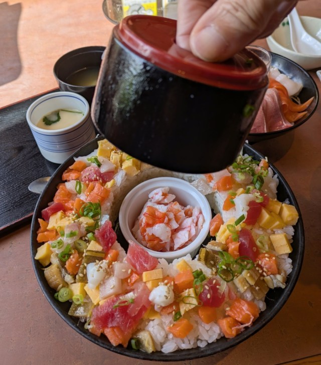 Seeing the three bowls stacked atop each other, like some sort of food pagoda, is surreal. It almost feels like an AI-generated image that you’d get from a prompt of “big sushi bowls,” but this is a real thing that actually exists, and the cuts of fish were beautiful.