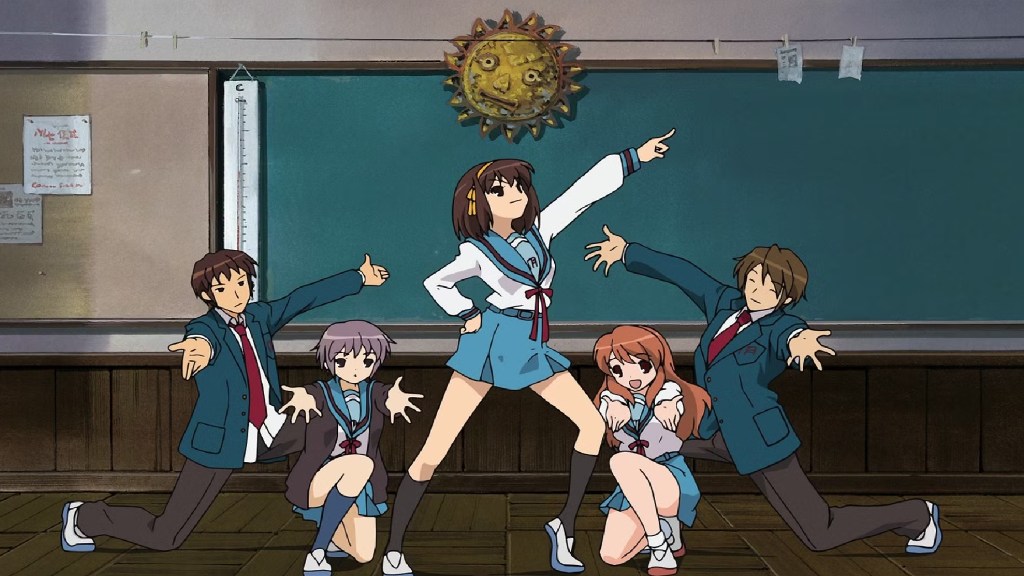 In Kyoto Animation’s The Melancholy of Haruhi Suzumiya, Kyon is forced by Haruhi Suzumiya to join the SOS Brigade, a club dedicated to finding the supernatural. What Haruhi doesn’t know, though, is that the other club members are the supernatural beings she’s looking for, who are observing Haruhi’s godlike powers, all of which Haruhi has to be kept unaware of.