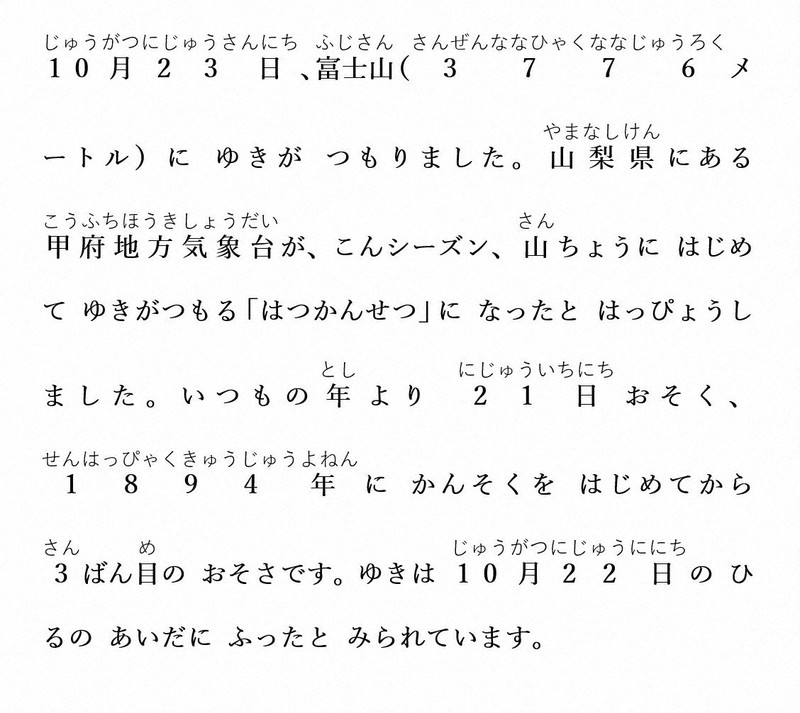 On October 23, snow accumulated on 3,776-meter-high Mount Fuji. The Kofu Local Meteorological Office in Yamanashi Prefecture announced that this marked the first snowcap on the summit this season. This is 21 days later than usual and the third latest occurrence since observations began in 1894. The snow is believed to have fallen during the daytime of October 22.