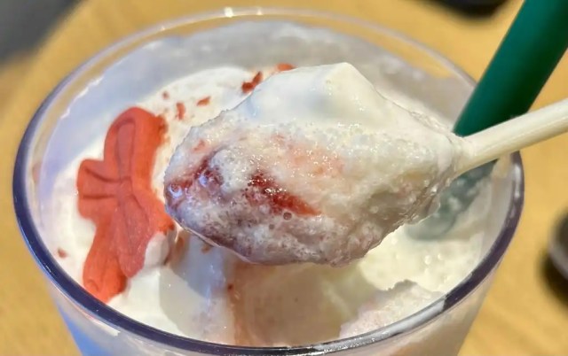 The blended ice base is a mixture of Joyful Medley and milk, and sitting at the bottom of the cup are large strawberry slices. Up top you get a swirl of whipped cream dusted with freeze-dried strawberries, and for an extra 55 yen (US$0.35) on top of the 700-yen base price you also get a cute holiday-themed cookie, either a ribbon, snowman, teddy bear, or doll.