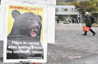 A sign in English warns international students about bears following sightings in and around Akita University in the city of Akita on Oct. 28. 2025. (Mainichi/Muneo Takahashi)