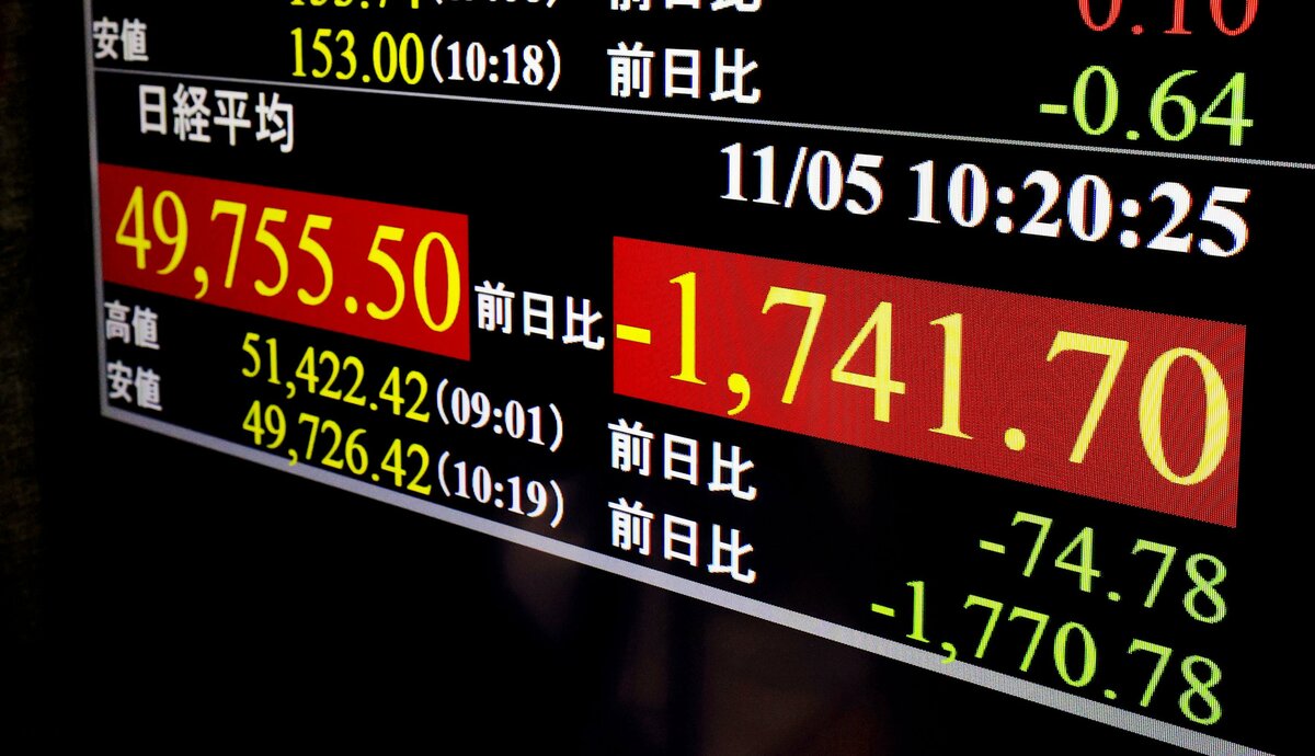 The 225-issue Nikkei Stock Average plunged 1,284.93 points, or 2.50 percent, from Tuesday to 50,212.27. The broader Topix index finished 41.85 points, or 1.26 percent, lower at 3,268.29.