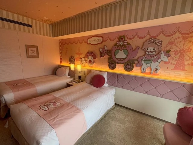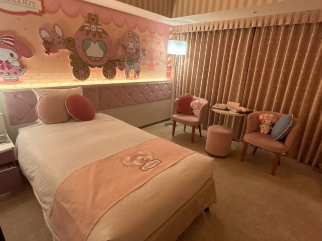Today, though, we’re taking a break from monster rampages and robot wars with a pair of hotel rooms with much more relaxed, and infinitely cuter, themes: Sanrio characters My Melody and Kuromi.
