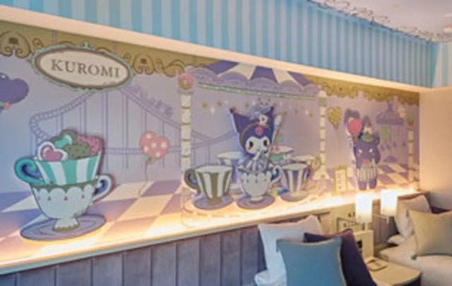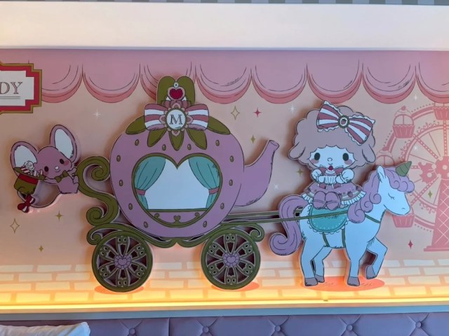 The decorations are sure to make any Sanrio fan squeal with glee, but the most impressive is the artwork on the wall that’s not just decals or wallpapering, but actual wooden carvings of the characters and their fancy fairytale-style carriage.