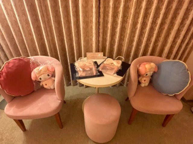 The room was obviously designed with big-time My Melody fans in mind, the sort of travelers who aren’t going to suddenly become indifferent to the character when it’s time to go back home. Thankfully, waiting on the chairs in the room are My Melody plushies, which guests can take with them when they check out.