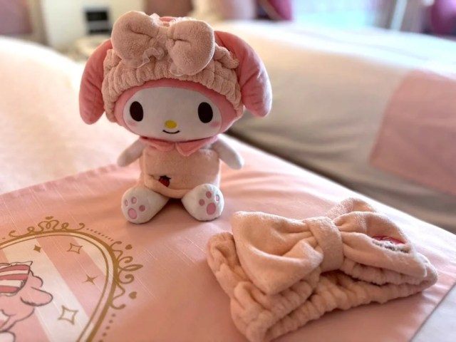 Those aren’t the only souvenirs that come with the room either. The terrycloth bath headband that My Melody is wearing? You get one too, as well as a My Melody pouch.