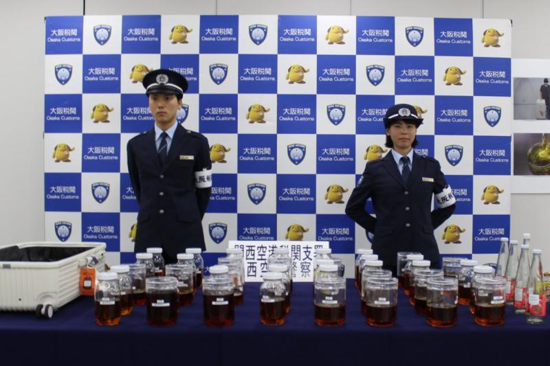 Upon entering the baggage claim area, Huang retrieved two pieces of checked luggage and was pushing the suitcases on a cart when a sniffer dog alerted police, Kansai Airport Branch Customs said.