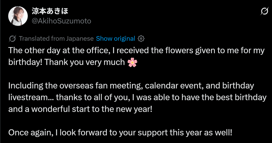 Suzumoto Akiho Saying Thanks for All the Birthday Flowers