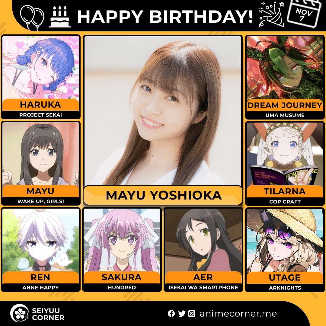 Happy 30th Birthday to Yoshioka Mayu🥂🎉 female voice actorsseiyuuvoice actorsvoice actresses 1 Comment inspyral 1 day ago Sources:[https://x.com/yoshioka_mayuC/status/1986468909432906200](https://x.com/yoshioka_mayuC/status/1986468909432906200)[https://x.com/WeeklyFamitsu/status/1986432223428690377](https://x.com/WeeklyFamitsu/status/1986432223428690377)[https://x.com/seiyuucorner/status/1986448498041184462](https://x.com/seiyuucorner/status/1986448498041184462)[Her birthday dountdown stream](https://www.youtube.com/watch?v=38yZYlGuxDk)