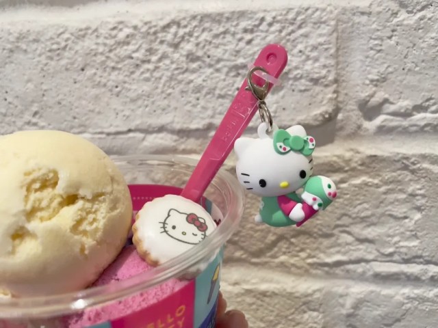 We suspect some fans might wash the cup out after they’re done eating so that they can keep it as a memento of this sweet moment, but even if you don’t, you also get a Hello Kitty charm, in which she’s enjoying a cone of Baskin-Robbins’ Popping Shower, perennially one of the chain’s most popular flavors in Japan. While it comes attached to the spoon, the charm can easily be unclipped and transferred to a bag strap or key ring.
