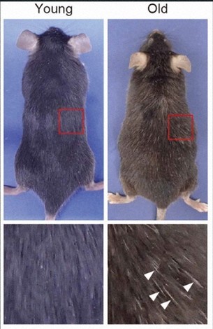 A mouse which has been artificially aged through radiation exposure is seen to the right, with graying hair. (Image courtesy of Emi Nishimura, the University of Tokyo’s Institute of Medical Science)