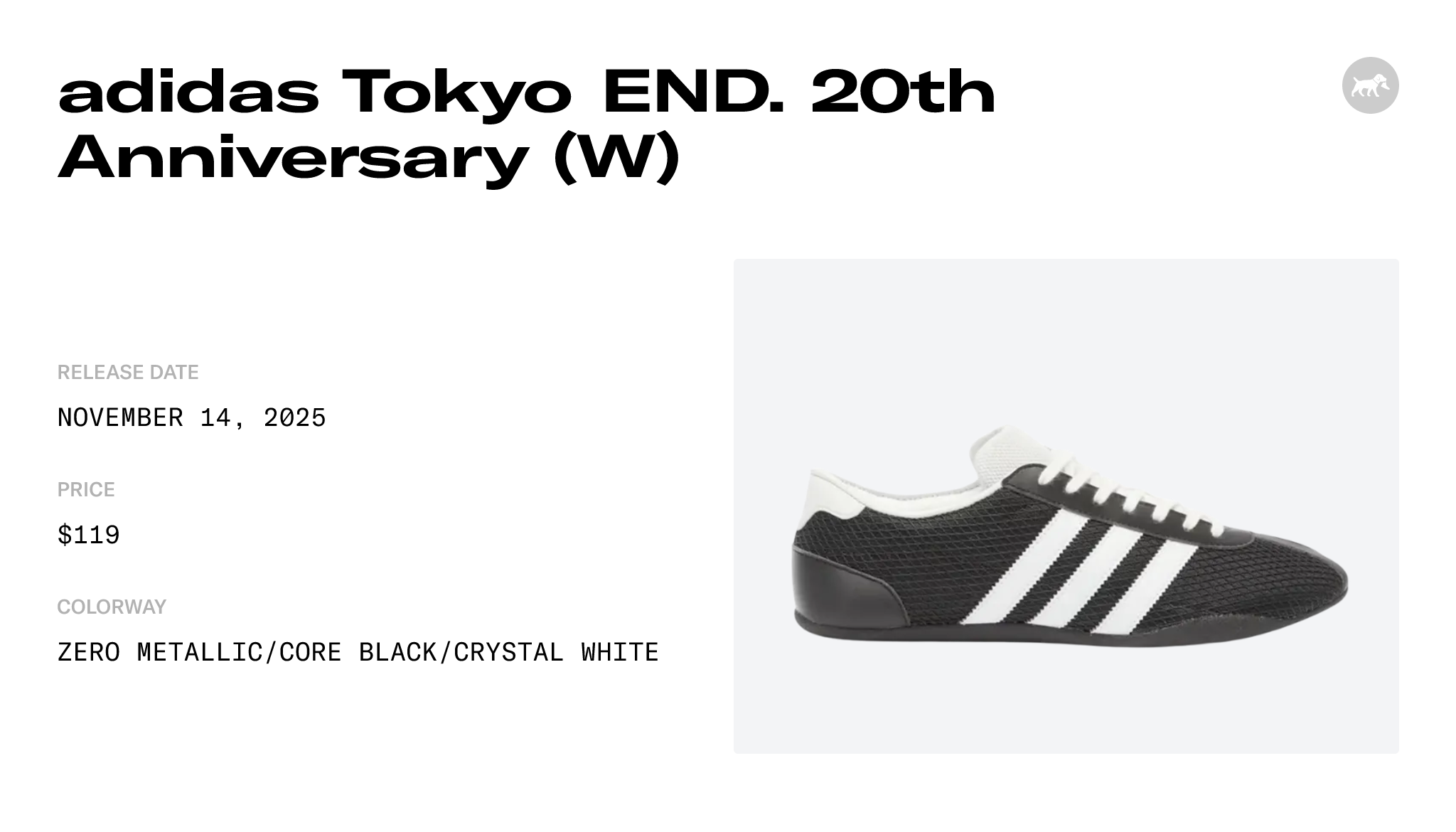 The adidas Tokyo END. 20th Anniversary (W) will release on Friday, November 14, 2025 for $119. Your best opportunity to get these right now is by entering raffles and waiting for the official releases.