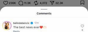 British tennis player Tara Moore, visibly overjoyed by the news, left a playful reaction in the comments.