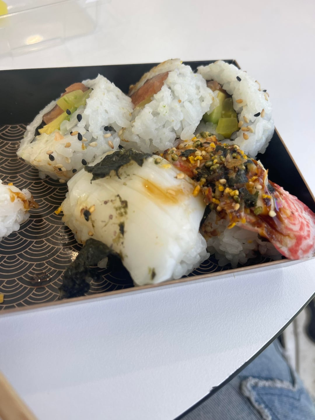 I didn’t eat it which I regret because I could’ve liked it. I tried to take a bite but it was a lot more rubbery and chewy than I expected, and the combination of that and not really knowing what it was kinda scared me. Depending on what exactly this is I will maybe try it properly next time I have sushi. But I’d like to know what it is to calm my nerves about it haha. It’s definitely some kind of meat I’m pretty sure but I’ve just never seen this before. I have some food issues but I’m trying to expand my options so I’d like to give it another chance