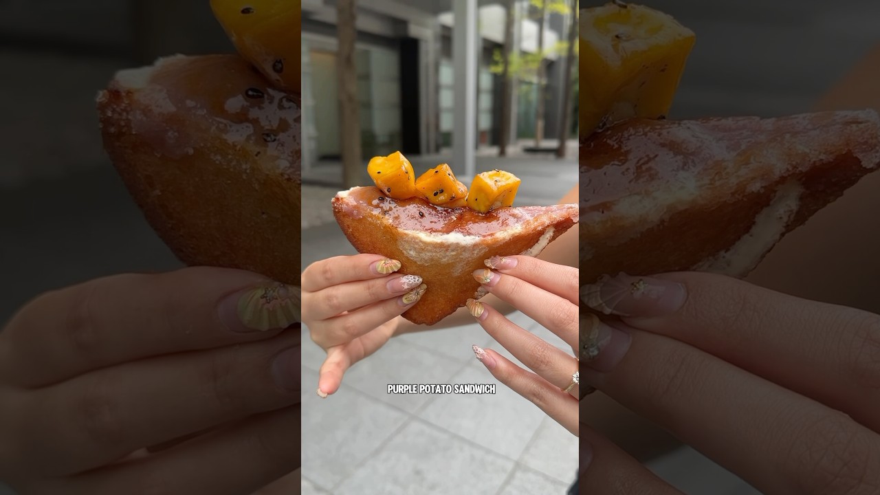 I finally tried the viral fry sandwich spot in Tokyo. Welcome to Agasan. I went right when they opened and there was still a 30-minute line. All of the sandwiches cost about5 to $6. I got this fruity one. Inside they’re going to put a lot of low sugar whipped cream and on top they added beautiful figs. They were so ripe and soft and it went so well with the raspberry sauce. The inside was really creamy while the sandwich outside is very crispy. This was delicious. I was so excited to try this purple potato sandwich. I love the candied sweet potatoes on top and it was so good. It was caramelized and sweet. My favorite part was the purple potato custard. I also got a salty option. I got the beef short rib yakiniku. The egg yolk and the barbecue sauce together was so flavorful. It was really messy to eat