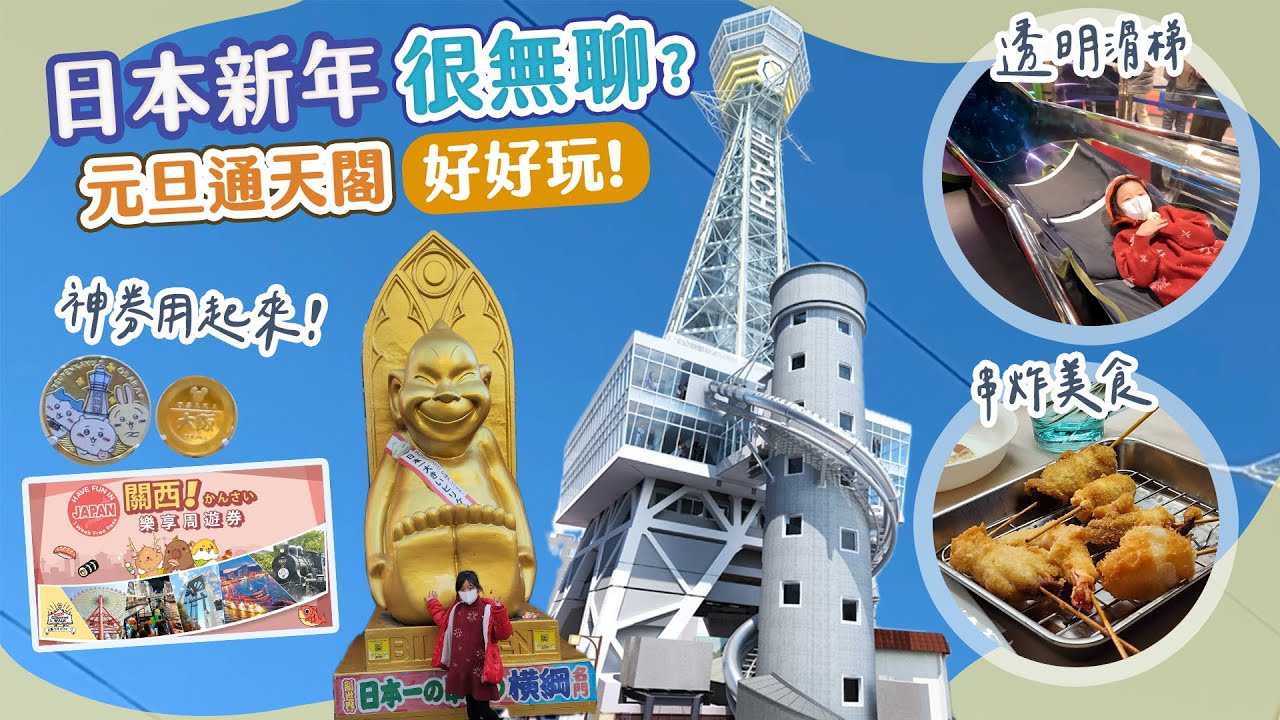 大家好 歡迎來到魚兒一家樂yo遊的頻道 我是可樂魚 很多人說 歲末年初的跨年期間去日本很無聊 因為很多店不是沒開 就是提早打烊 熱門景點更是人擠人 讓旅遊品質大打折扣 但其實只要事先做好功課 還是能安排行程玩得盡興唷! 這天我們就安排元旦也有營業的景點 早上去通天閣 使用關西樂享周遊券玩溜滑梯 品嘗新鮮的串炸 下午再去環球影城 品嘗大阪必吃的章魚燒 再入園玩到閉園 讓一整天都超充實 快跟我們一起來看看 元旦的日本有多好玩吧! 早安 我是魚兒一家樂yo遊的可樂魚 現在是我們的關西之旅第五天 今天要去通天閣 玩那個聽說很好玩的溜滑梯 然後下午要再去環球影城 用我們的年票進去玩唷 這是什麼?