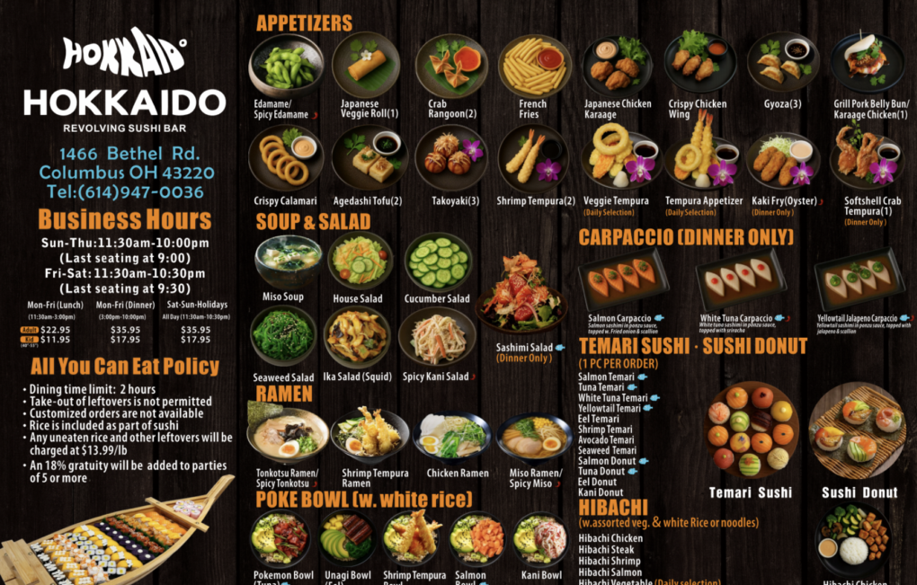 Starting today, guests can grab all-you-can-eat sushi and other items at Hokkaido Revolving Sushi Bar, newly located at 1466 Bethel Rd. The experience is from the minds of Tony Jiang and Mandy Lin, a husband/wife duo that own the longtime favorite Coco Cuisine, also on Bethel.