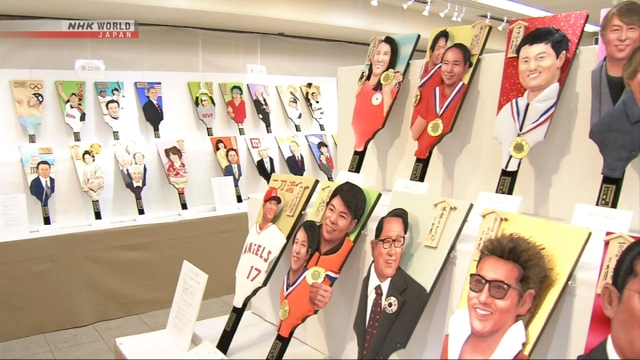 More than 300 “hagoita” decorative wooden paddles bearing images of celebrities are on display in Tokyo.