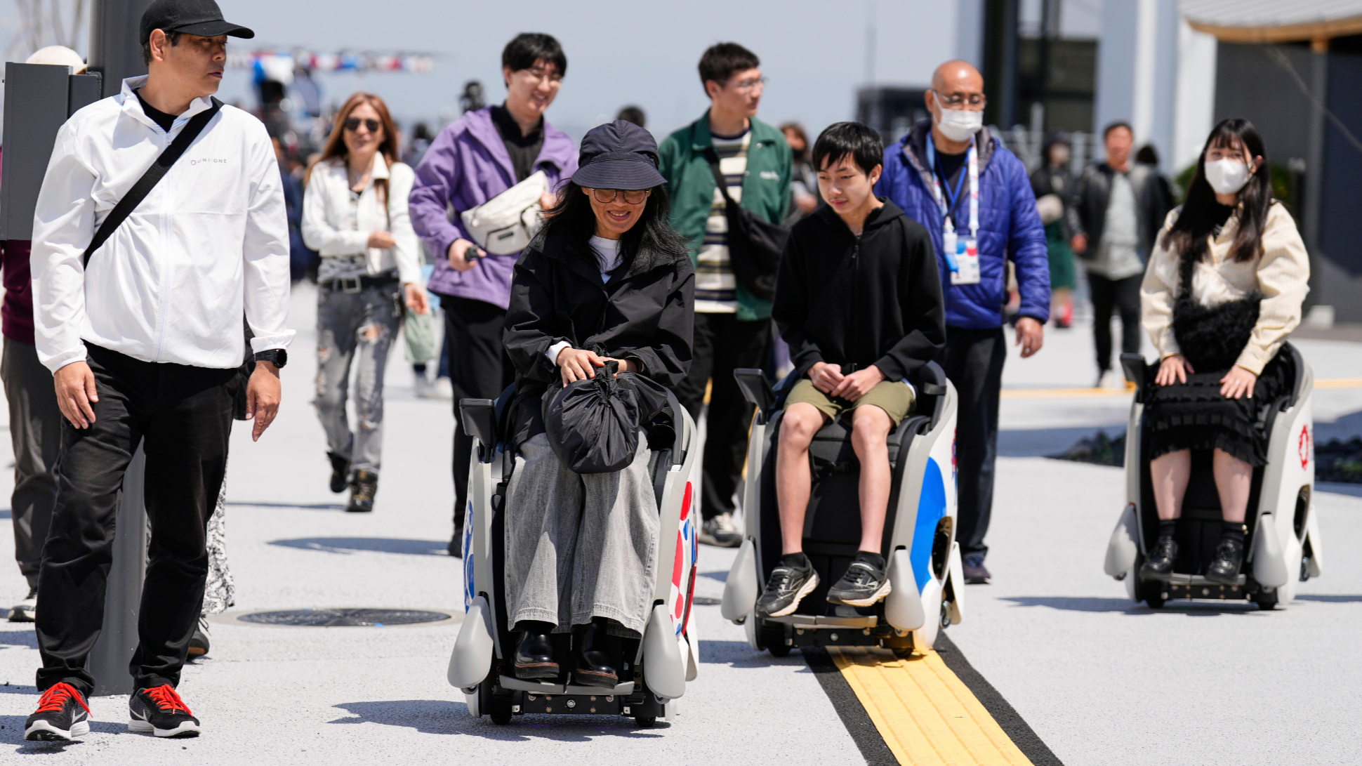 Three visitors try maneuvering UNI-ONE electric mobility devices built by Honda during the Expo 2025 in Osaka, western Japan, April 14, 2025. (PHOTO / AP)