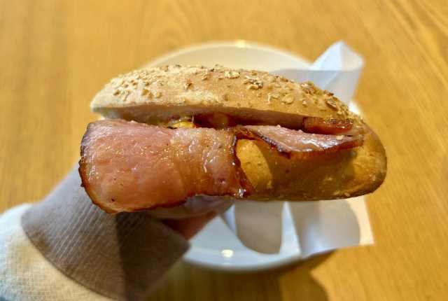 ▼ The bagel sandwich, while simple in flavour, is filled with thick-cut bacon and cheese, and is utterly delicious.