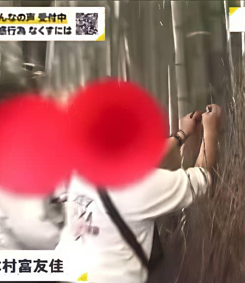 In the broadcast, one of the tourists can be seen scratching the letter ‘M’ onto a bamboo stalk at the famous Arashiyama Bamboo Forest in Kyoto.