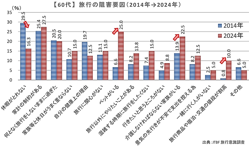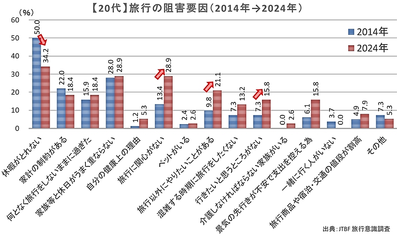 In 2024, the obstacles to travel, such as “I have pets” and “I have family members to care for,” which were previously just over 10%, have increased significantly, ranking second and third overall. In addition, the obstacle of “expensive travel packages, accommodation, and transportation,” which was rarely selected in 2014, is also on the rise.