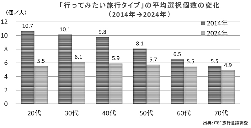 Looking at the “types of trips 20s would like to take,” most types of trips decreased in 2024 compared to 2014. A decade ago, younger people had a greater number of types of trips they wanted to take, but this number tended to decrease as people got older. However, today, the range of travel interests seems to be roughly the same for both young and older people.