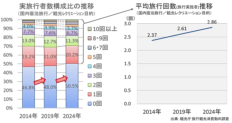 Looking at the breakdown of the actual number of travelers taking domestic overnight trips (for tourism and recreation), the ratio of people who do not travel even once a year will rise from 46.8% in 2014 to 50.5% in 2024. On the contrary, the ratio of people who travel four or more times a year is also increasing at the same time, as data show that  the average number of trips taken by those who travel (people who travel at least once a year) increase by approximately 0.5 trips from 2.37 trips in 2014 to 2.86 trips in 2024.