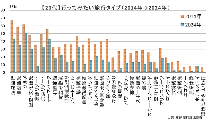 Meanwhile, the travel rate among 20s has been increasing over the past 10 years, and JTBF said that this may be because of easier taking vacation than before and the government’s leading work style reforms. However, blocking factors such as “not being interested in traveling,” “having other things to do besides traveling,” and “there is no place I want to go,” which were not very prominent in 2014, are on the rise in 2024.