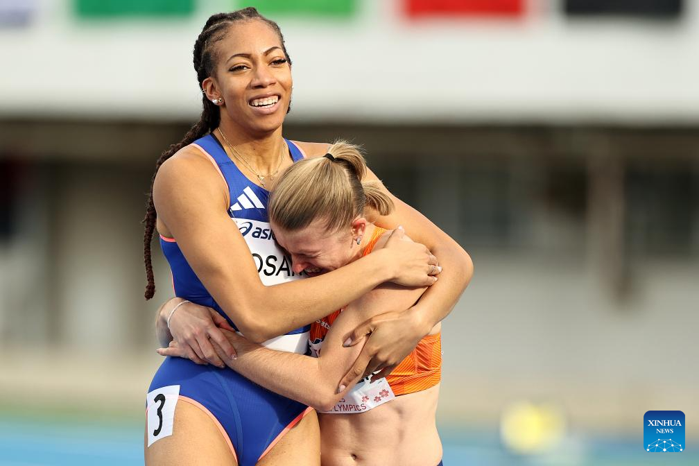 Elaine Janice Den Exter (R) of the Netherlands and Pamera Losange of France celebrate after the women’s 100m final of athletics at the 25th Summer Deaflympics Tokyo 2025 in Tokyo, Japan, Nov. 18, 2025. (Xinhua/Jia Haocheng)