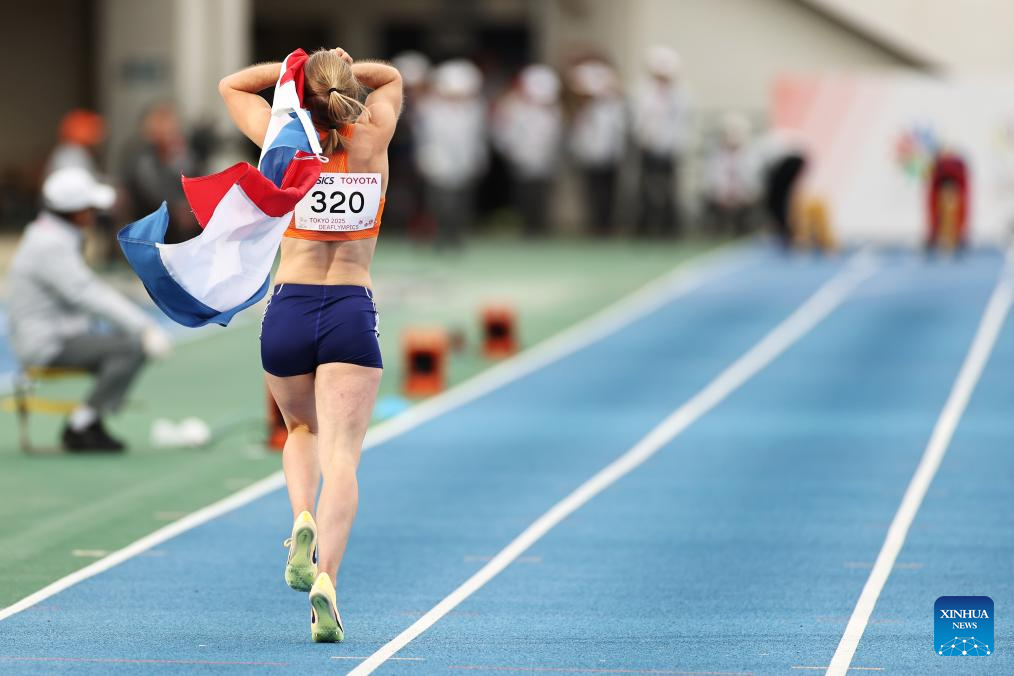 Elaine Janice Den Exter of the Netherlands celebrates after the women’s 100m final of athletics at the 25th Summer Deaflympics Tokyo 2025 in Tokyo, Japan, Nov. 18, 2025. (Xinhua/Jia Haocheng)