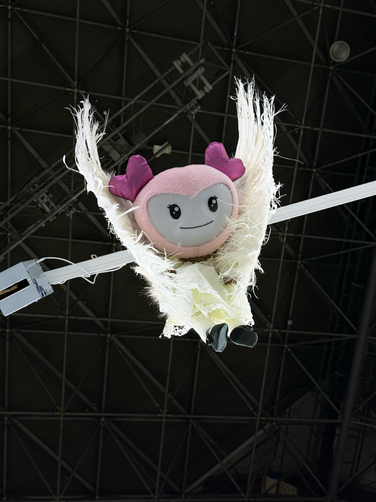 ACK’s public program, curated by Martin Germann and Kimura Kokoro, draws inspiration from a major historic milestone: the Kyoto Protocol, which entered into force twenty years ago. Adopted in 1997 at ICC Kyoto — Sachio Otani’s seminal architectural achievement, winner of Japan’s first national design competition in 1963 — the Protocol reawakens here as a living memory. Art activates the building, not only as a physical container for works but as a historical residue etched into the very structure. Right at the entrance, Berlin-based artist Phung-Tien Phan greets you (or perhaps disorients you) with an absurd assemblage — a witty, deadpan reflection on the constructed theater of contemporary identity, online and offline. Inside, Stella Zhong’s Yolk Velocities (2020) stretches time itself, echoing the slow, suspended hours of the pandemic. Installed as a site-responsive work within ICC Kyoto’s iconic brutalist architecture, it captures Zhong’s playful, meta-reflexive approach.
