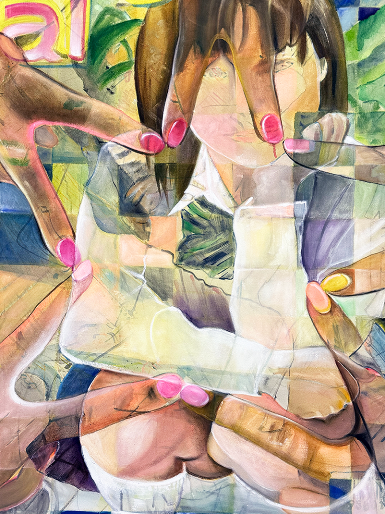 Nearby, Taro Nasu hosts Gladstone, presenting Precious Okoyomon’s new plus companions, hung from the ceiling and welcoming the public. Gallery 16, Murata (Tokyo) pairs with Matthew Brown (Los Angeles), featuring Omari Douglin’s paintings inspired by past travels through Japan; Crèvecooeur shows two works by Louise Sartor. Tokyo-based gallery 4694 exhibits vibrant works by London-based Motoko Ishibashi — a technicolor dive into online imagery and contemporary culture — while also hosting Chicago’s Good Weather, showing Nancy Lupo’s subtle transformations of everyday objects. And Misako & Rosen brings the thread full circle with works by Phung-Tien Phan, reconnecting to the public program.
