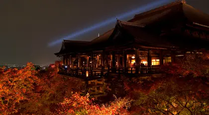 Konkai Komyoji Temple (also known as Kurodani Temple) is located near the Philosopher’s Path in Kyoto and has strong ties to the times of samurai. It is well known for its garden dubbed the “Purple Cloud Garden,” lined with many maple trees that are illuminated at night. The waters lace through the gardenscape and reflect the surroundings, creating oblong shapes and flowing autumn colors.