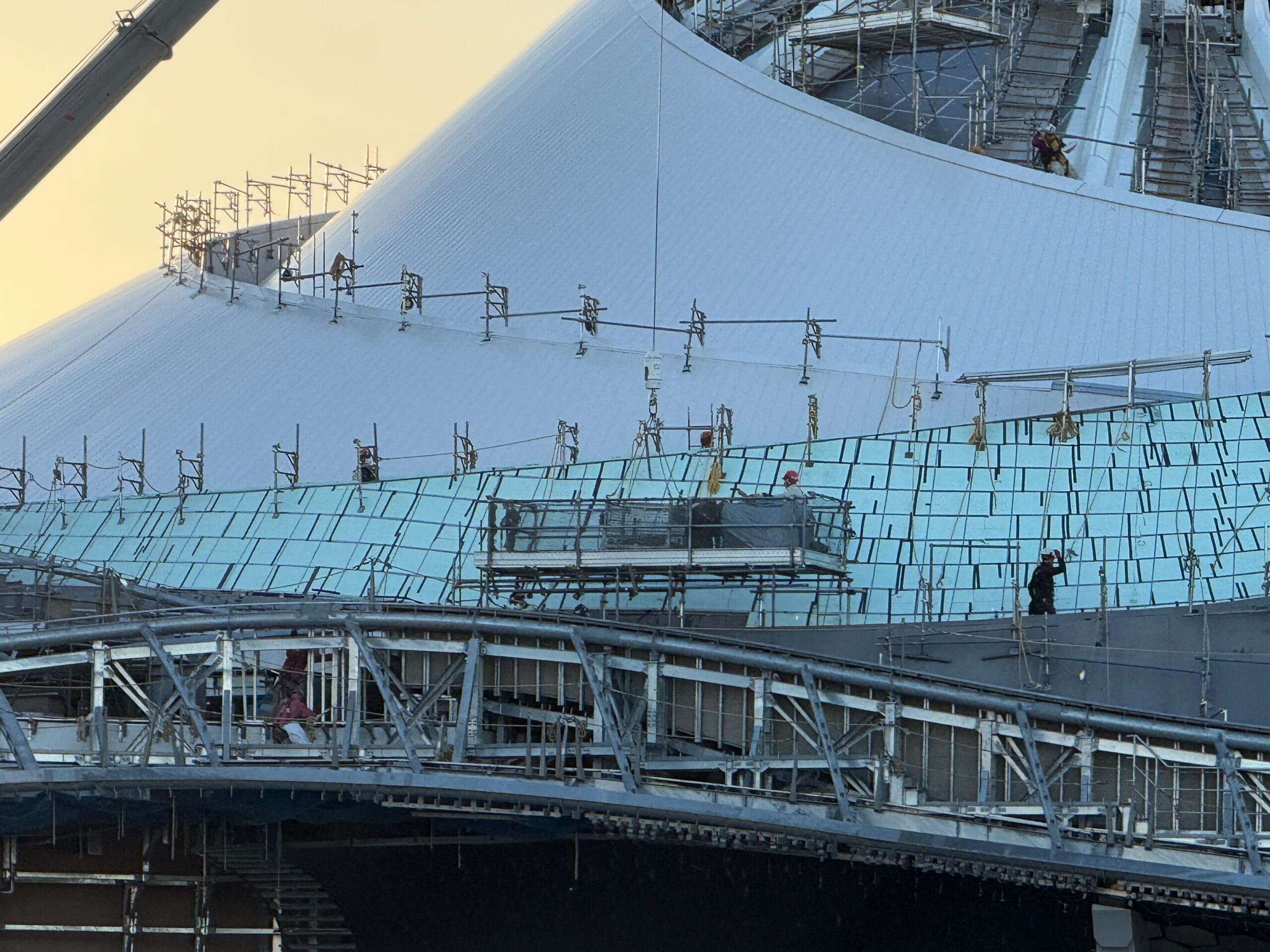 Crew members were working on a section of paneling that appears to be covered with protective sheets.