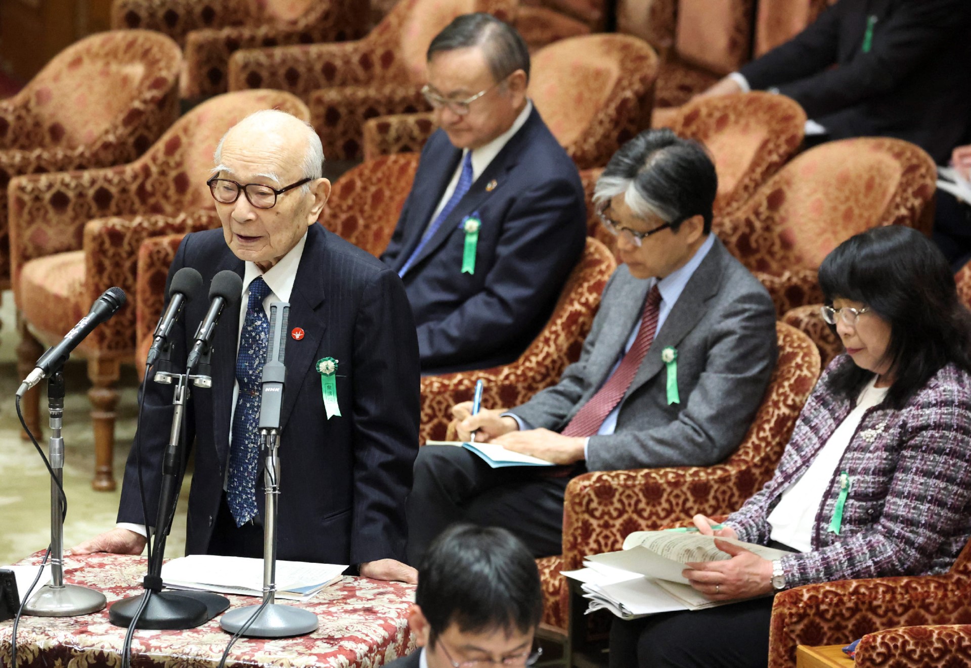 Member of the Nihon Hidankyo and atomic bomb survivor co-chair Terumi Tanaka makes a statement at the central public hearing of the House of Representatives Budget Committee at the parliament in Tokyo on Feb 25, 2025. (PHOTO / AFP)